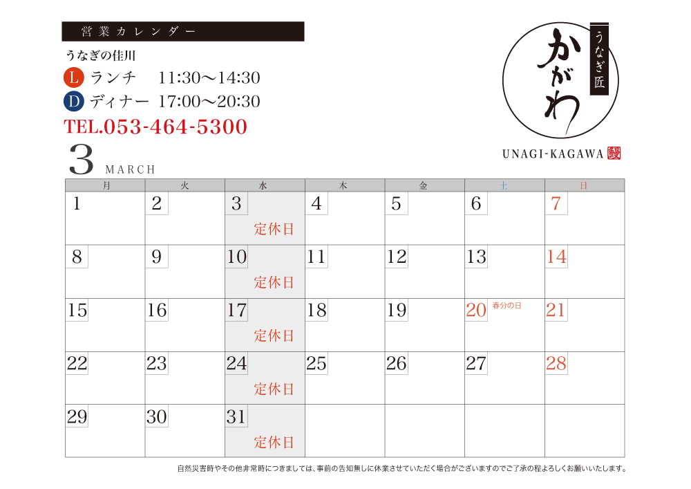 3月の営業日時につきましては、下記のチラシに詳細を掲載しております。