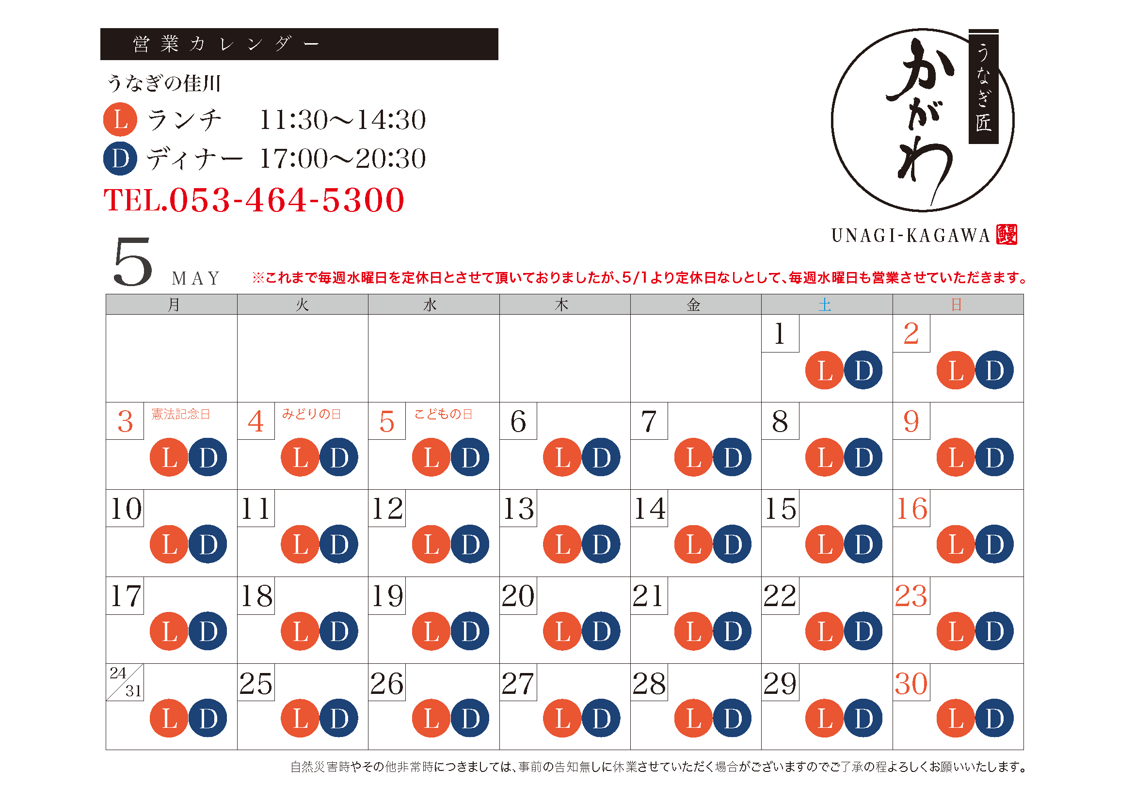 5月の営業日時につきましては、下記のチラシに詳細を掲載しております。