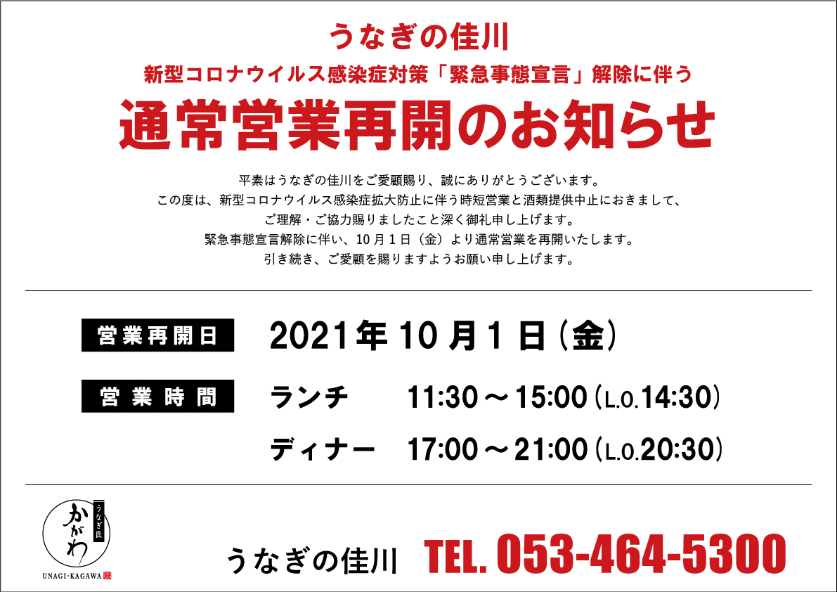 緊急事態宣言解除に伴い、10月1日(金)より通常営業を再開いたします。