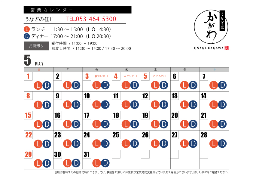 5月の営業日時につきましては、下記のチラシに詳細を掲載しております。