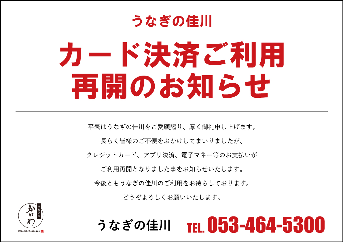 長らく皆様のご不便をおかけしてまいりましたが、クレジットカード、アプリ決済、電子マネー等のお支払いがご利用再開となりました事を、お知らせいたします。