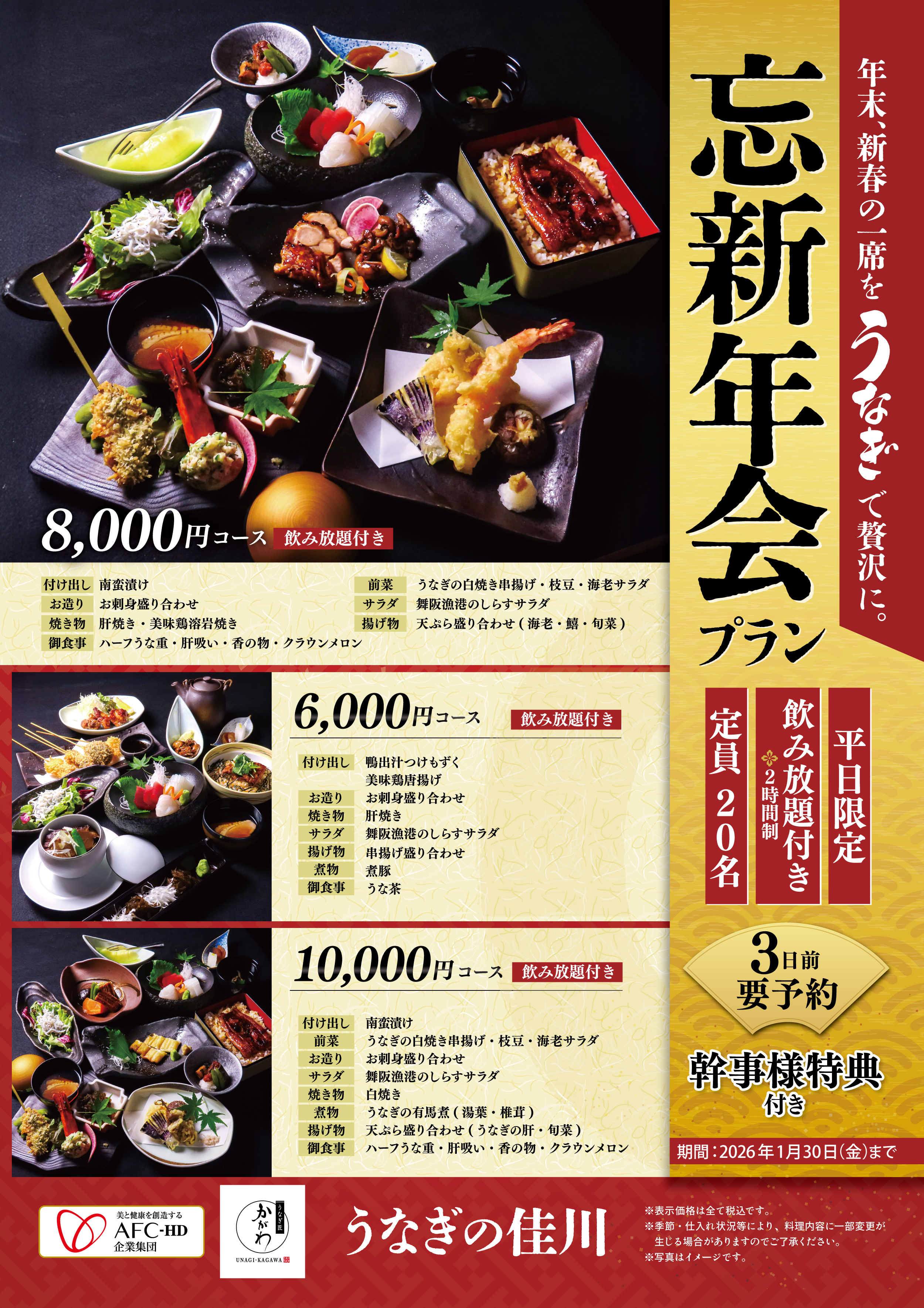 仲間と盛り上がる会社の忘年会や、年始のスタートを華やかに飾る新年会まで、この冬は、ぜひうなぎの佳川でお過ごしください。